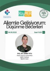 Hasan Kalyoncu Üniversitesi Eğitim Fakültesi öğretim üyesi ve Merkez Kurul Üyesi Doç. Dr. Cemre Tatlı tarafından “Ailemle Gelişiyorum: Düşünme Becerileri Etkinliği”, 4 Ekim 2025 tarihinde Kavaklık Bilim ve Sanat Merkezi’nde gerçekleştirilecektir. Etkinlik, BİLSEM öğrencilerinin velilerine yönelik olarak planlanmıştır.